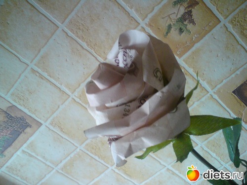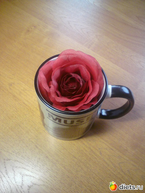 И вот какие подарки она от нашего семейства получила. Мы по её просьбе заказали кружку с изображением любимой музыкальной группы, и я сделала розу из денежных купюр. Зацените! Я не поленилась купить искусственную розу и на снятый бутон одела заготовку с купюрами. Да простит меня святой Фен-шуй за такое обращение с деньгами!...