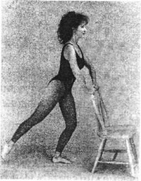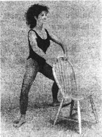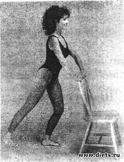 Опираясь руками на опору (спинку стула), поднимайте назад, не сгибая, правую ногу.