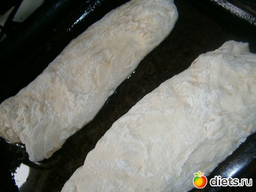 Я решила сделать не круглую чиабатту, а в виде батона. Через положенное время, я вытащила тесто, разделила его на 2 части и сформировала две колбаски. Уложила на смазанный маслом противень и оставила расстаиваться 30 минут.