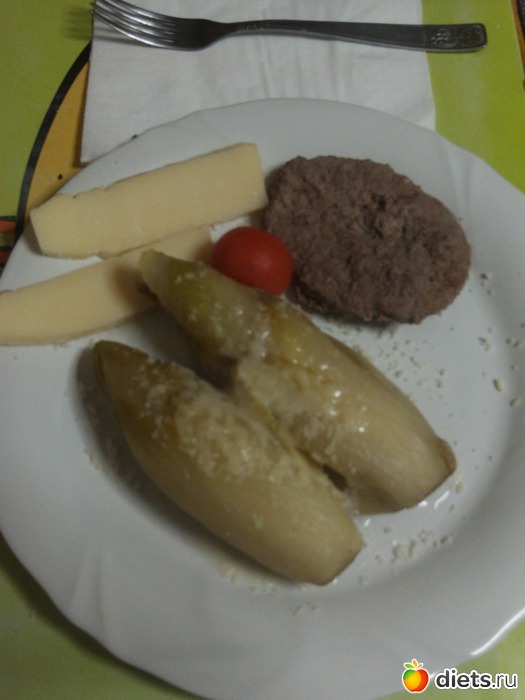 два отварных цикория+отварная говяжья котлета+два кусочка сыра+помидорка