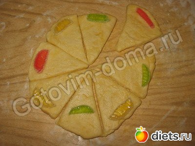 Просеять муку и добавить жир, развести в тёплом молоке пачку быстро растворимых дрожжей или 25г мокрых, добавить в молоко соль, сахар, яйцо и дать постоять 10 минут в тепле, вылить в муку и налить водку или ром(я налила ром) и замесить тесто если будет туговато то можно добавить молока. У меня даже пришлось добавить муку когда раскатывала,. хорошо вымешанное тесто положить в холодильник и включить разогреваться духовку на 180 градусов. Приготовить начинку, у меня было варенье густое, можно ещё празднично сделать, набить грецких орехов и взбить белок и смешать получиться очень вкусная начинка. Когда прошло полчаса тесто не нужно вытаскивать из холодильника, просто возьмите один кусок и раскатайте. не переживайте про толщину чем тоньше тем вкуснее, но и слишком тонко тоже не надо, потому что будут очень хрупкие и сломаться и не будут иметь внешнего вида. Раскатали лист и найдите дома большую тарелку положите её на лист и вырежете круг. Затем по диагонали разрежьте на восемь кусков у вас должно получиться восемь треугольников.