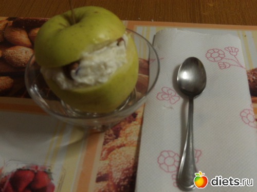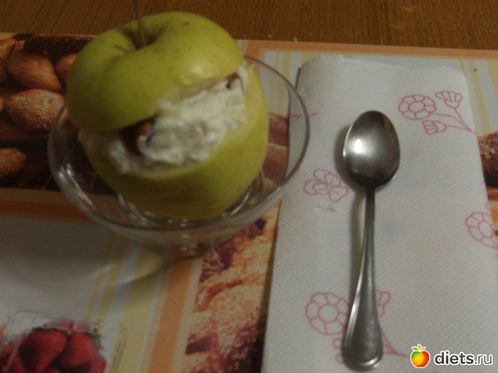 яблочко волшебное, а внутри риккота+внутренности яблока натёртые+8 орешков лесных, должно быть 10 штук, но два ореха погибли смертью храбрых при исполнении своего предназначения. Они были просто съедены в процессе приготовления.