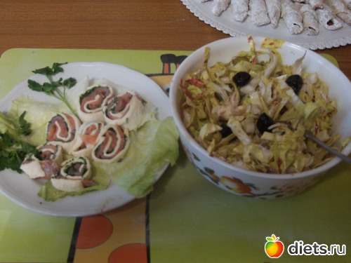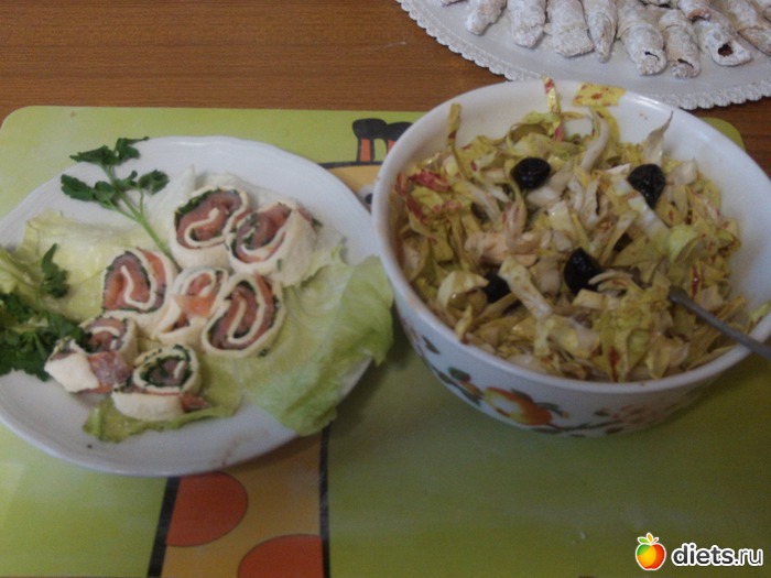 попробуйте вы пообедать когда перед тобой целая тарелка сладостей. Но я мужественно это сделала.(вернее женственно)Вы знаете что любая женщина может три вещи сделать из нечего. Салат, прическу и скандал. Вот и я решила начать с первого. Сделала салат из салата+оливки зелёные+оливки чёрные+сыр типа брынзы несоленой и доела утренний рулет нямка какая