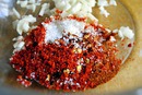 Чеснок раздавите, нарежьте и смешайте с солью, паприкой и перцем.