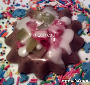 Сверху положите наши «сухофрукты» – небольшие кусочки цветного мыла, оставшиеся с предыдущих мыловарений или приготовленные заранее.