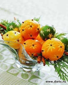 Простые, оригинальные и вкусные новогодние украшения для дома можно изготовить из обычных апельсинов и яблок с помощью сухой гвоздики и палочек корицы. Отбираем целые бутоны сушеной пряной гвоздики. Крупные, ровные и приблизительно одинаковые по размеру апельсины моем и насухо вытираем. Наносим шилом на поверхность плодов орнамент или рисунок, а затем через одинаковые по длине промежутки втыкаем по линиям рисунка гвоздичинки «ножкой» внутрь. Можно превратить такой апельсин в настоящий новогодний шар, обвязав его золотой ленточкой и прикрепив с ее помощью к нему палочку корицы.