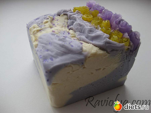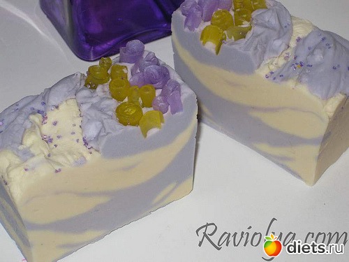 Самое главное, чуть не забыла, как я делала такие разводы. В одну часть мыла добавила фиолетового красителя, другая стала кремового цвета сама по себе (первый раз такое, но мне сыграло на руку, цвет красивый). Сначала в форму из под палочек ватных выливала часть кремовой массы, потом часть сиреневой, как пирог “Зебру” делаем. Вот и все.