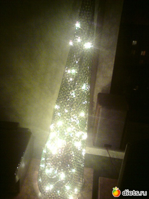 И тут, благодаря всемирной паутине, я вспомнила, как видела самодельно сделанную елочку из сетки для упаковки букетов и за полчаса сварганила очень даже миленькую техно-елочку. Я использовала пластмассовую сетку из строительного магазина (у меня валялся приличный кусок, свернула её конусом, срезала лишнее, что мешало стоять, развернула опять и разложила на ней гирлянду, которую закрепила по всей сетке канцелярскими скрепками (это изнанка), затем опять свернула конус и закрепила края теми же скрепками. на всякий случай я установила внутри конструкции стеклянную банку 1.5л. вышло дешево и мило! наверху есть звезда - в кадр не поместилась))) Дети оценили мамину креативность!