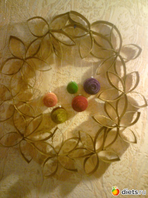 А еще мне очень понравились поделки из рулончиков от туалетной бумаги( я стала их собирать) и за два вечера мы с детворой сделали очень милый рождественский венок. Время заняло высыхание после покраски аэрозолью шоколадной и бронзовой краской. мы решили, что здесь не хватает зеленого, поэтому венок еще претерпит изменения, когда я куплю нужный оттенок!