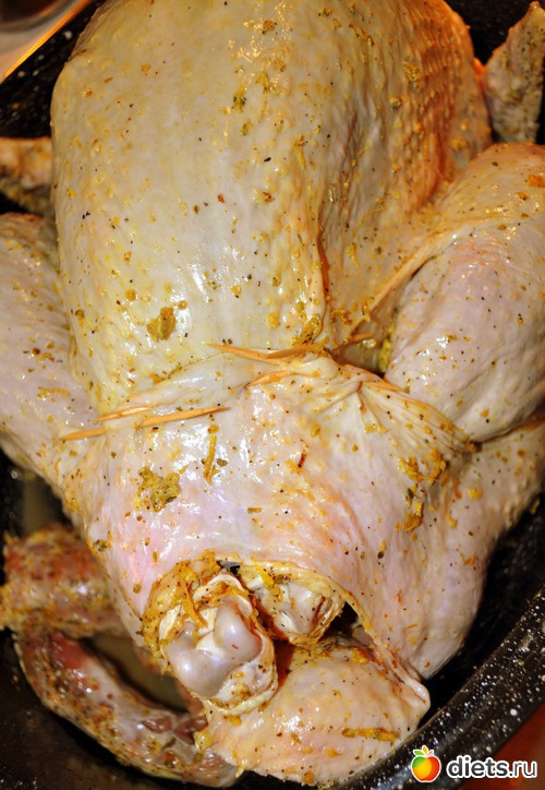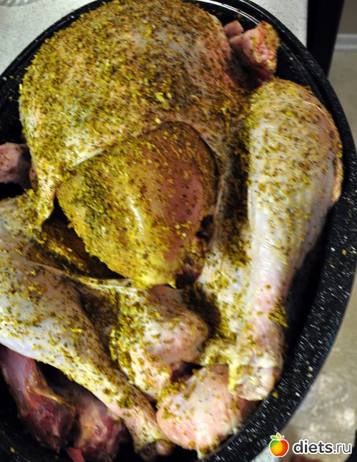 Промызываем все индейку и внутри и снаружи приправами и оставим на несколько часов на сухом маринаде.