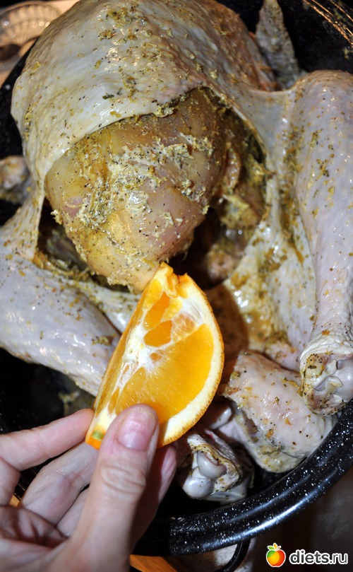 Промаринованную индейку выниваем из пакета и положив внутрь пол-апельсина закрепим шпажками