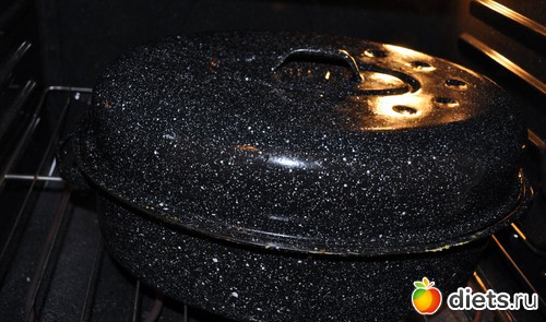 Через два часа открыть её и поливая образовавшимся соком еще держать в печи час.