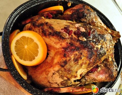 Готовую индейку с пылу с жару обложить нарезанными апельсинами для ароматности и подержать в печи 10-15 минут
