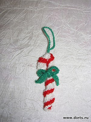 1 ряд лицевыми петлями, затем петли закрыть. Завяжите бант вокруг трости. Пришейте витой шнур к вершине трости.