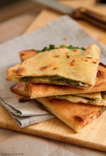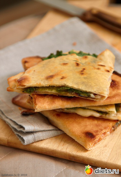 - Выложить начинку на одну из лепешек, накрыть второй (я выпекла одну и сложила пополам). Отправить в микроволновку/духовку, чтобы, к примеру, сыр в начинке (как у меня) расплавился. Разрезать.