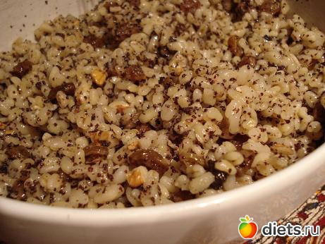 Пшеницу отварить до готовности и дать остыть. В остывшую пшеницу добавить мед, грецкие орехи, изюм, истолченный и сваренный в подслащенной воде мак. Все перемешать, сложить в форму и сверху присыпать сахарной пудрой.