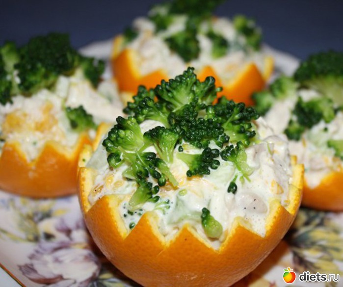 Брокколи разобрать на соцветия. Отдельно отрезать ножки. В кипящую, хорошо подсоленную воду сначала бросаем ножки капусты - они варятся 4 мин, затем соцветия - они будут готовы через 2 минуты. Капусту вынимаем из кипятка. Она должна остыть. Огурцы нарезаем кубиками. Апельсин разрезаем пополам и вынимаем мякоть. Мякоть нарезаем кубиками. Часть соцветий капусты и ножки нарезаем помельче. Отваренное и остывшее филе курицы нарезаем. Все нарезанные продукты складываем в глубокую ёмкость. В ёмкость добавляем майонез. Всё тщательно перемешиваем. Полученной смесью фаршируем подготовленные апельсины. Готовое блюдо украсьте соцветиями брокколи и зеленью.