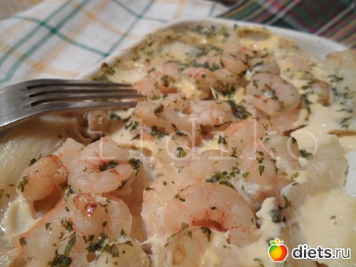 Выложила креветки на рыбу, можно застелить форму фольгой.. Обжарила муку в масле до золотистого цвета, помешивая, чтобы не было комков, постепенно влила молоко (можно сливки, если рыба нежирная), потом белое вино. Добавила мускатный орех, соль, перец и зелень. И этой смесью залила наши неукротимые креветки. И в духовку их..