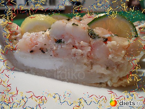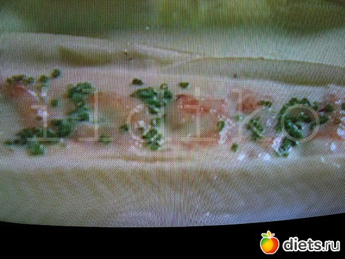 Вот такие они, на самом деле, эти розовые и симпатичные креветки... Я бы ещё много чего рассказала бы про них, но ведь у нас сегодня тема - кулинария. Так что, придётся мне эти милые розовые существа обуздать в их порывах и пристратиях и приготовить для нас, гурманов и любителей морепродуктов, что-нибудь такое - эдакое... изысканное... например, креветки в рыбном филе и запечёные в винном соусе.. Признаюсь, сама идея - не моя, подсмотрела на своём любимом кулинарном канале. В этот раз была передача английского телевидения прямо с кулинарной школы, где обучали новичков всяким вкусным премудростям. Ну, а так как венгерский язык я ещё не скоро выучу, то пришлось мне самой догадываться по видеоряду, сколько, чего и когда... Кстати, и вам всем рекомендую пофантазировать. Самое (почти) главное в этом блюде - это тарелочка, такая знаете для селёдочки.. длиненькая.. у меня такой не нашлось, венгры не едят солёные: ни рыбу, ни грибы. Ну, я и обошлась своей имеющейся формой, а для вас - вдохновляющее фото с телевизора.