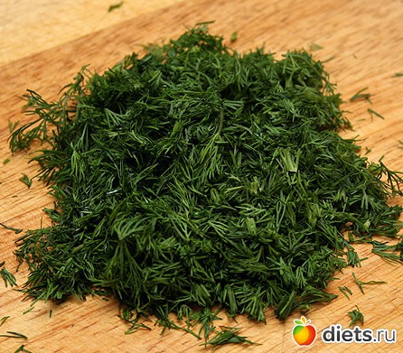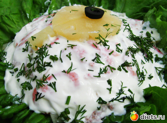 Сверху украшаем долькой ананаса и посыпаем оставшейся зеленью. Вот и финиш!