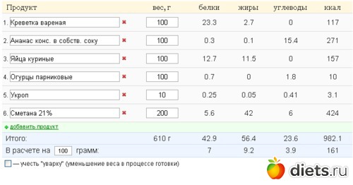 Смешиваем в салатнице креветки, огурцы, ананасы, яйца и заправляем салат слегка подсоленной сметанкой