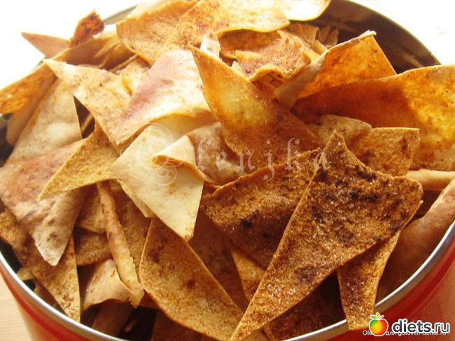 Лучше всего, если чипсы вы выложите в один слой на противень. Но это не всегда удается сделать, потому что лепешек много, духовка одна, а гости ждут угощения. Тогда я выкладываю все лепешки сразу, а в процессе запекания несколько раз перемешиваю их, меняя местами те, что были сверху и уже подсохли, с теми, что оказались под ними. В итоге все чипсы равномерно запекаются до изумительного хруста и приятного цвета.
