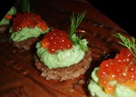 Собственно бутерброды: французский батон или с отрубями. порезать на тонкие ломтики, в духовке довести до состояния гренок (чтобы хрустели). Готовим крем из сметаны и чеснока (чеснока совсем чуть-чуть для запаха), можно смешать сметану с желтком яйца. смазываем этим кремом наши гренки и на них помещаем кусочек копченого рыбного балыка и порцию красной икры. Украсить можно веточкой укропа и пером лука. Попробуйте. очень вкусно.