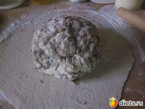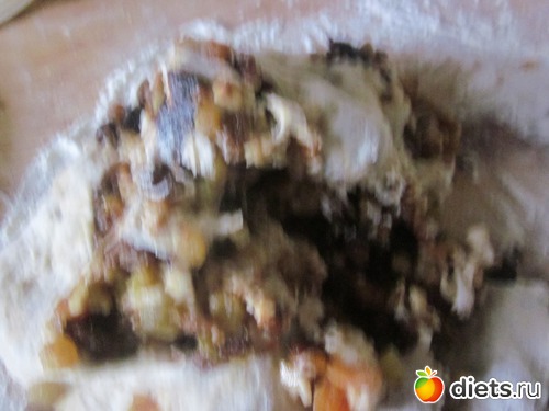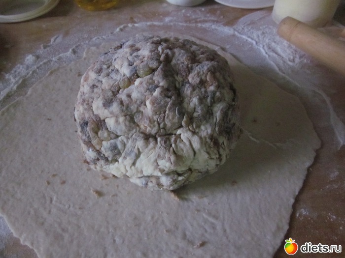 Собрать края теста над начинкой. На стол насыпать муку(я немного насыпала, у меня мука хлебная, ей не много надо) и начать вымешивать тесто, чтобы начинка распределилась равномерно. Т. к. фрукты влажные, то тесто размокает и при вымешивании надо добавлять муку~~~1 стакан. Я вымешивала минут20-25.