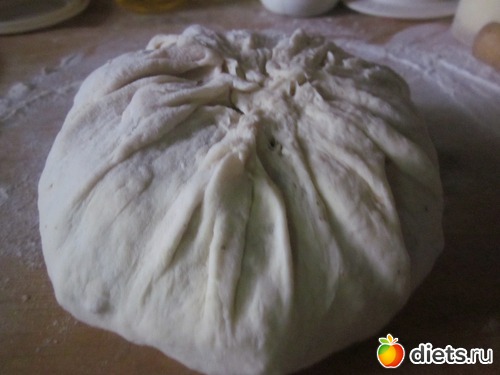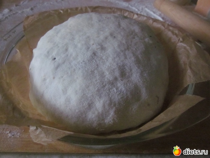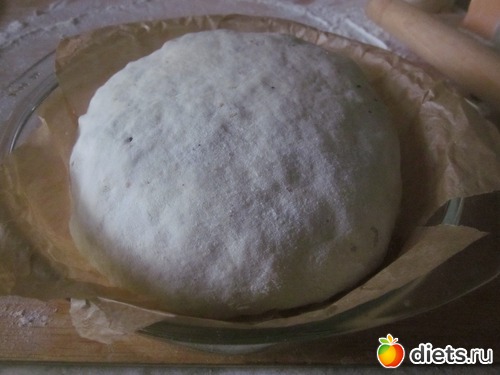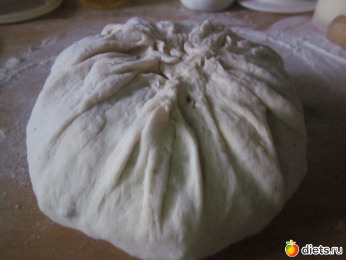Готовое тесто скатать в шар. Отложенное тесто раскатать в большой тонкий пласт и слегка смазать водой.