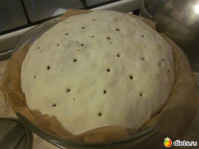 От подошедшего теста отрезать~ 1\5 часть и отложить. Остальное раскатать в круг. Выложить начинку.