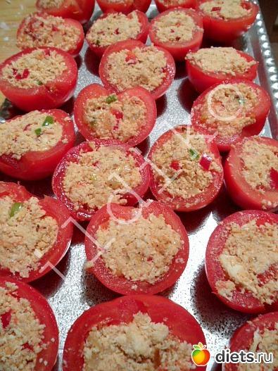 Помидоры необходимо пополам разрезать, вычистить мякоть. Посолить, поперчить.