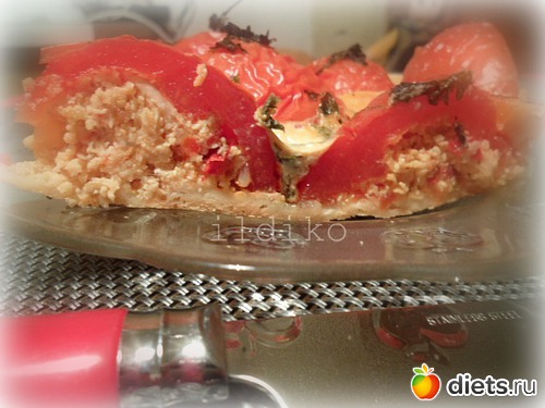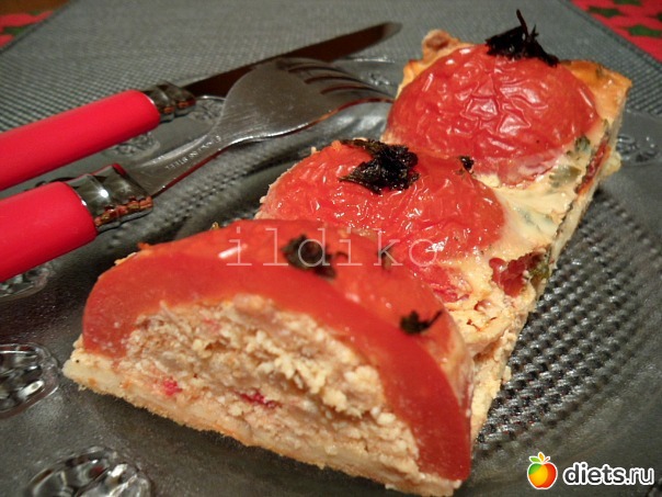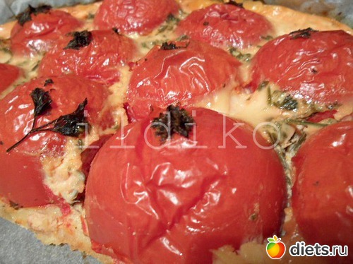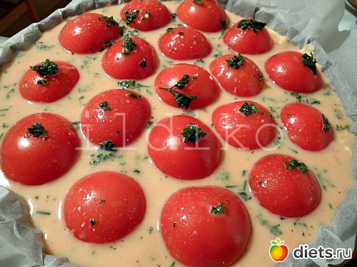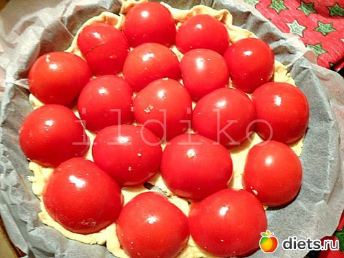 Раскатать тесто по форме, которую лучше взять лучше небольшую, потому что теста полчается совсем немного. Уложить наши половинки помидоры срезом вниз,