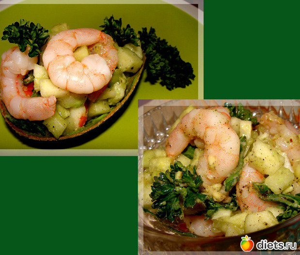 Нарезаем мелко яблоко, зеленый лук, огурец, авокадо, половинку лайма и крабовые палочки - все смешиваем, добавляем креветки (без жидкости) и очень хорошо перчим. Соль добавлять НЕ надо!