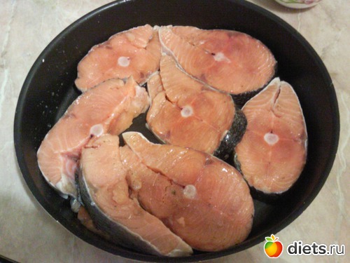 Рыбу промыть, почистить, нарезать порционно. Уложить в форму, посолить.