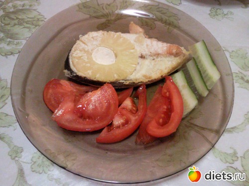 На каждый кусочек рыбы положить колечко ананаса. Запечь в духовке минут 40 при 180 град.