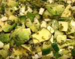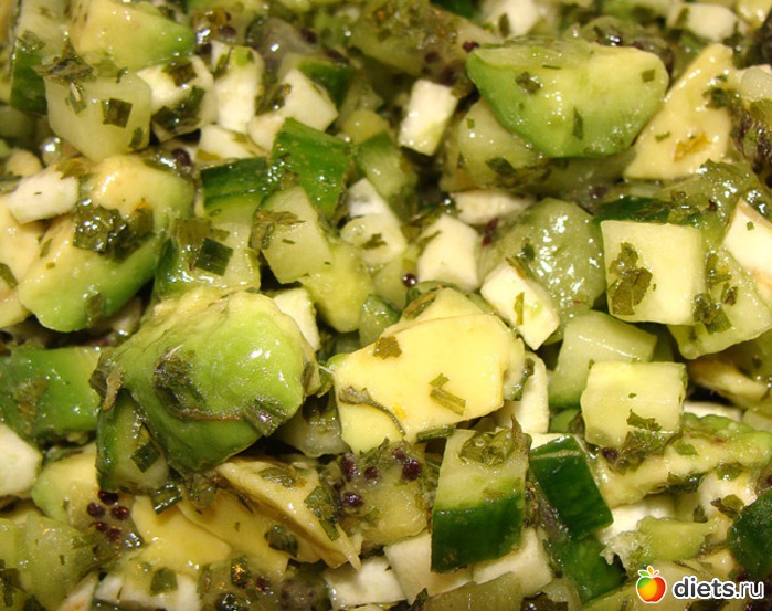 Авокадо очищаем, режем кубиками. Добавляем к овощам-фруктам вместе с нарезанными зеленым луком и петрушкой.