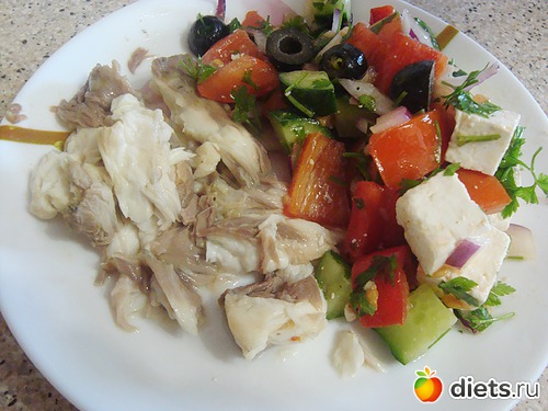 Обед-вареная рыба, греческий салат.