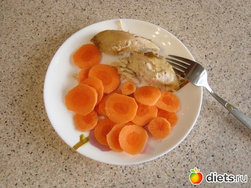 Завтрак - курица запеченная (грудка), морковь. - 110 ккал, 19.2 б, 0.9 ж, 4.2 у