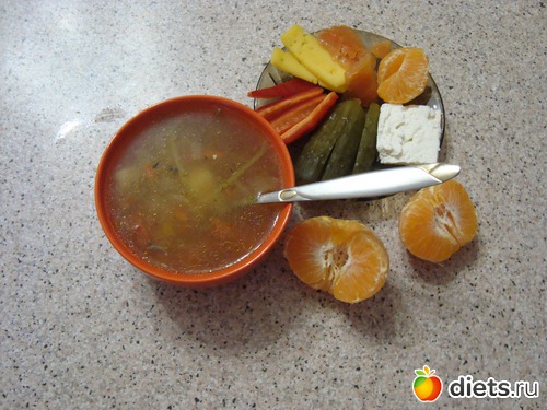 Обед - уха, соленые огурчики, перец, сыр, брынза, мандарины, соленая семга + маленький кусочек пиццы закадром (около 60 гр) - 341 ккал, 24.4 б, 13.9 ж, 29.1 у