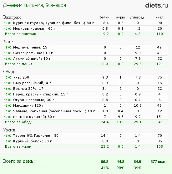 За день - 677 ккал, 66.8 б, 14.8 ж, 64.5 у