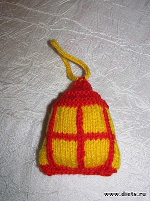 Продолжить красной пряжей – 4 ряда платочной вязкой.