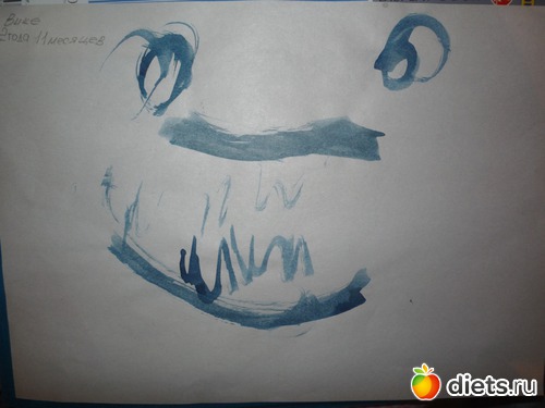 спрашиваем что это? Она грит акула! (хотя ей всего 2г.11мес.) я не знаю конечно в этом возрасте детки сейчас у всех умеют так рисовать, но я честно скажу не могла, тем более красками=))) То что карандашом и ручкой она у меня орудует довольно не плохо и уже умеет рисовать и человечка и рыбку и птичку, я знала, но красками оО=) вообщем мы с мужем были приятно удивленны