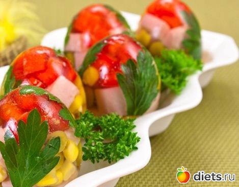 Сверху уложить, чередуя, ветчину, кукурузу, перец и листики зелени -
