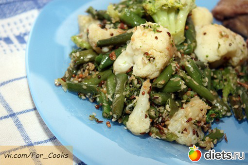 Выкладываем овощи к специям (если они замороженные, их не надо никак предварительно подготавливать) и готовим минут 7-10, помешивая до готовности. Не забудьте посолить. Можно ненадолго накрыть овощи крышкой.