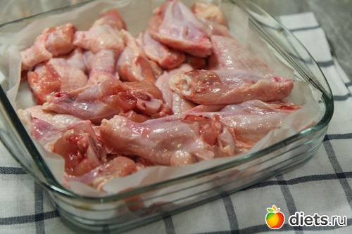Крылышки вымыть, порезать пополам и выложить в форму.