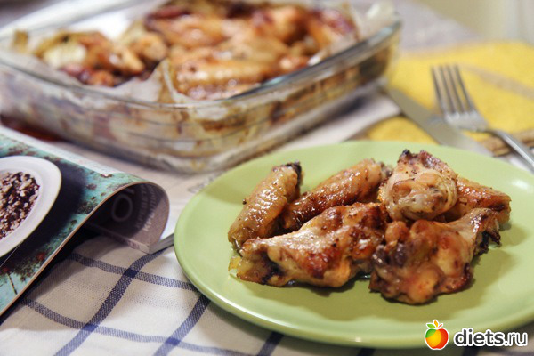 Крылышки посолить и залить соусом. Отправить в хорошо разогретую духовку на 30-40 минут. Блюдо готово.