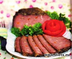Остудить мясо до теплого состояния, не вынимая из пароварки. После поместить его под пресс до полного остывания. Завернуть в фольгу и положить в холодильник на 12 часов. После охлаждения нарезать кусочками правильной формы и выложить на тарелку. Украсить зеленью.