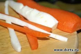 Корень пастернака и морковь очистить и нарезать продольными тонкими брусочками.