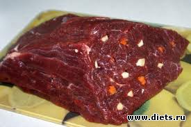 Вынуть говядину из раствора, обсушить бумажным полотенцем. В куске мяса длинным тонким ножом сделать продольные проколы и вставить в них брусочки моркови и пастернака.