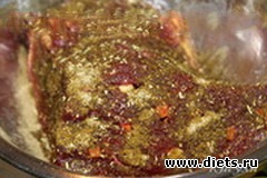Мясо натереть перцем, обсыпать со всех сторон пряностями. Поместить на решетку пароварки и готовить под крышкой 1 час с одной стороны, затем перевернуть кусок и готовить еще 50 минут.